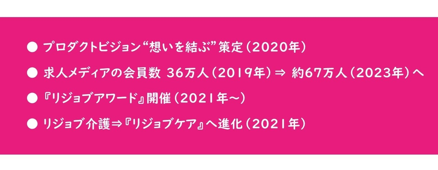 そして、2015年に新卒2年目メンバー2名が「介護業界の採用課題を解決したい」と立ち上げた介護業界特化型求人メディア『リジョブ介護』は、6年間のサービス運用を経て、より現場ニーズに応えられるようにと2021年に『リジョブケア』へと進化。「支援する業界の拡大」「扱う領域内での専門性特化」という二つの方向性でのサービス拡充に至り、扱う職種を従来の16種→31種へと、約2倍に拡充しました。