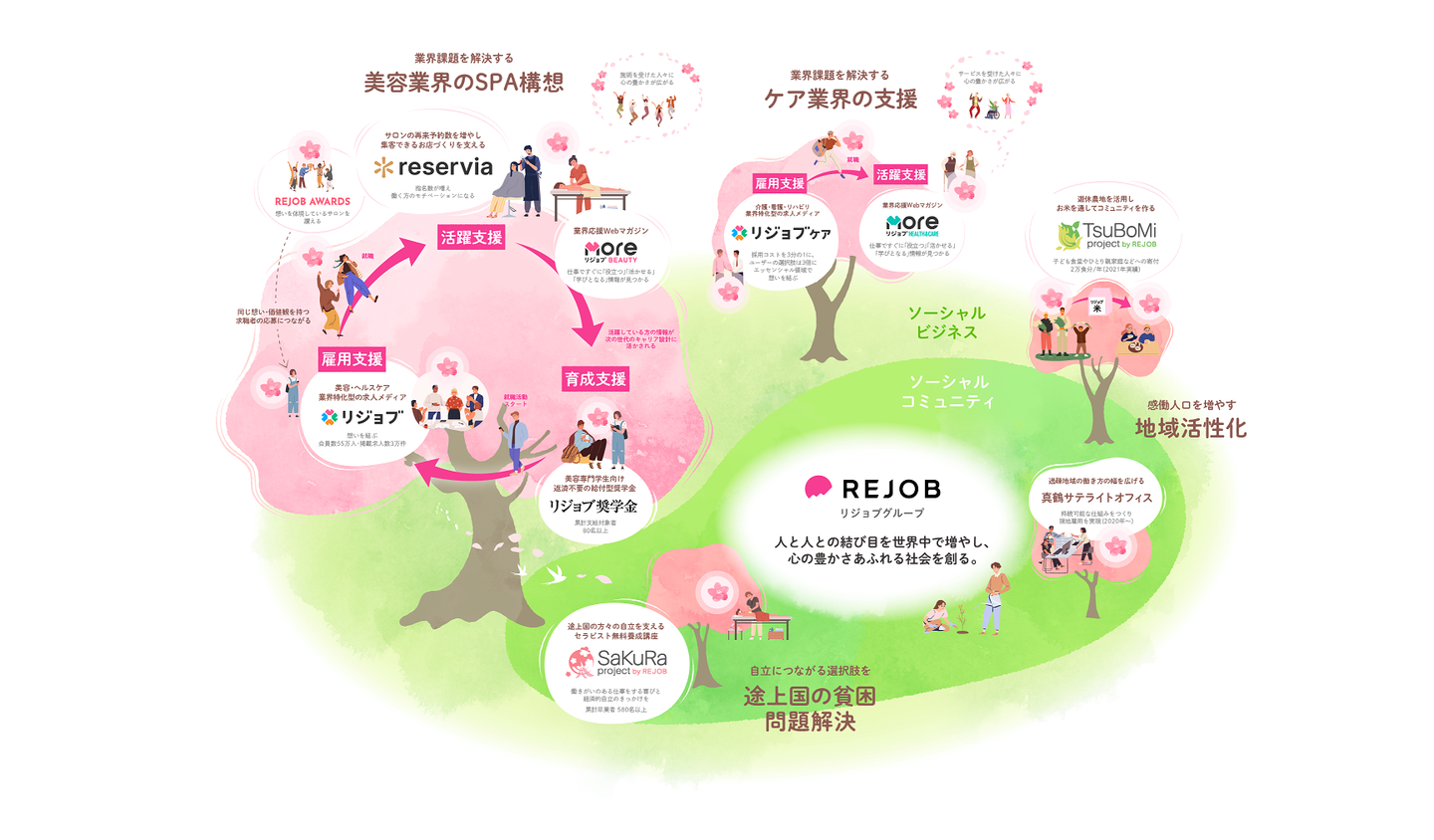 …ちなみにマップの左上にある『美容業界のSPA構想』は、「企画・製造・小売」というアパレル業界のSPAのモデルを美容業界向けにリジョブ流にアレンジして、『美容業界の育成支援・雇用支援・活躍支援』という流れに置き換えたものです。各ステージを一気通貫支援するビジネスや取り組みを通して、リジョブでは業界従事者が「長く、自分らしく」活躍し続けられる世の中を目指しています。