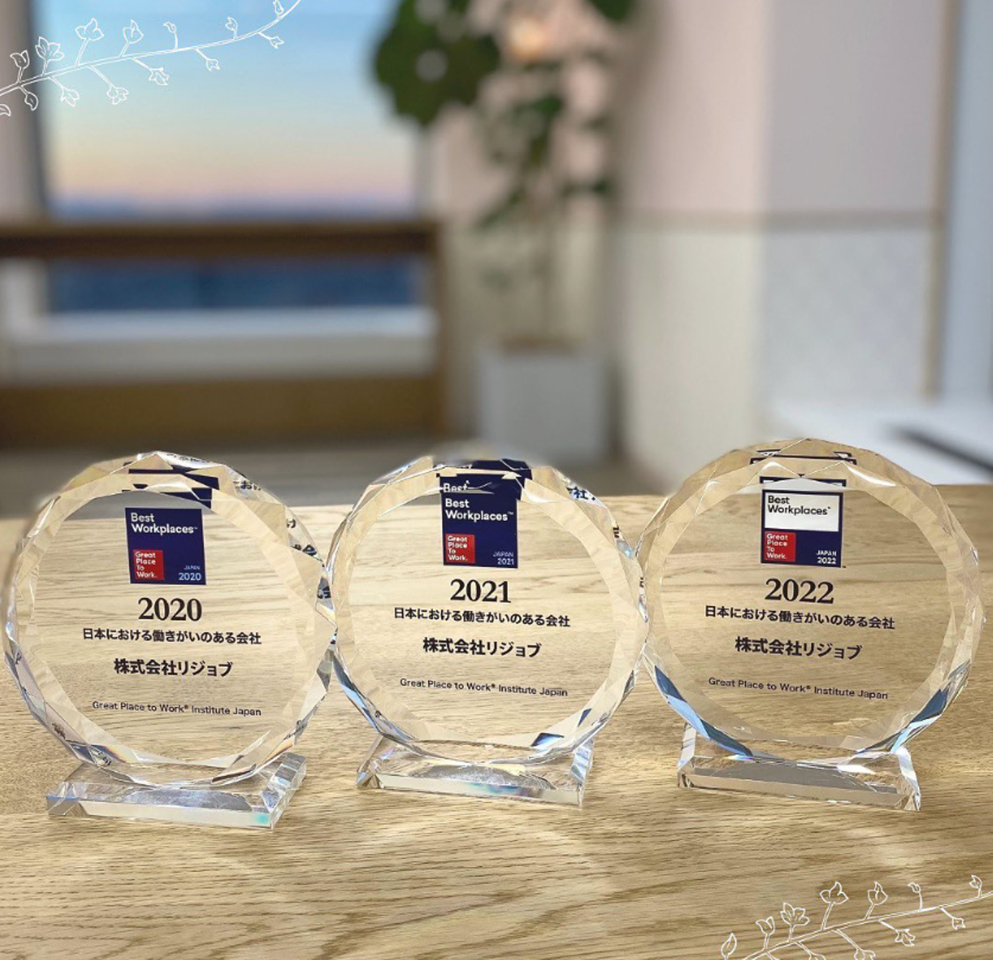ひとつ目は、世界約100か国で従業員意識調査を行うGreat Place to Work® Institute(以下、GPTW)による「働きがいのある会社ランキング」。リジョブは中規模企業部門にて、2020年より3年連続で、上位100社に贈られる『日本における働きがいのある会社ランキング ベストカンパニー』に選出されました。私たちは「一人ひとりが仕事を通して”誰かの役に立っている”と感じられる、働きがいの創出」と「働きがいを実現するための、働きやすい環境整備や施策実施」を通して、働き方改革に挑戦しています。