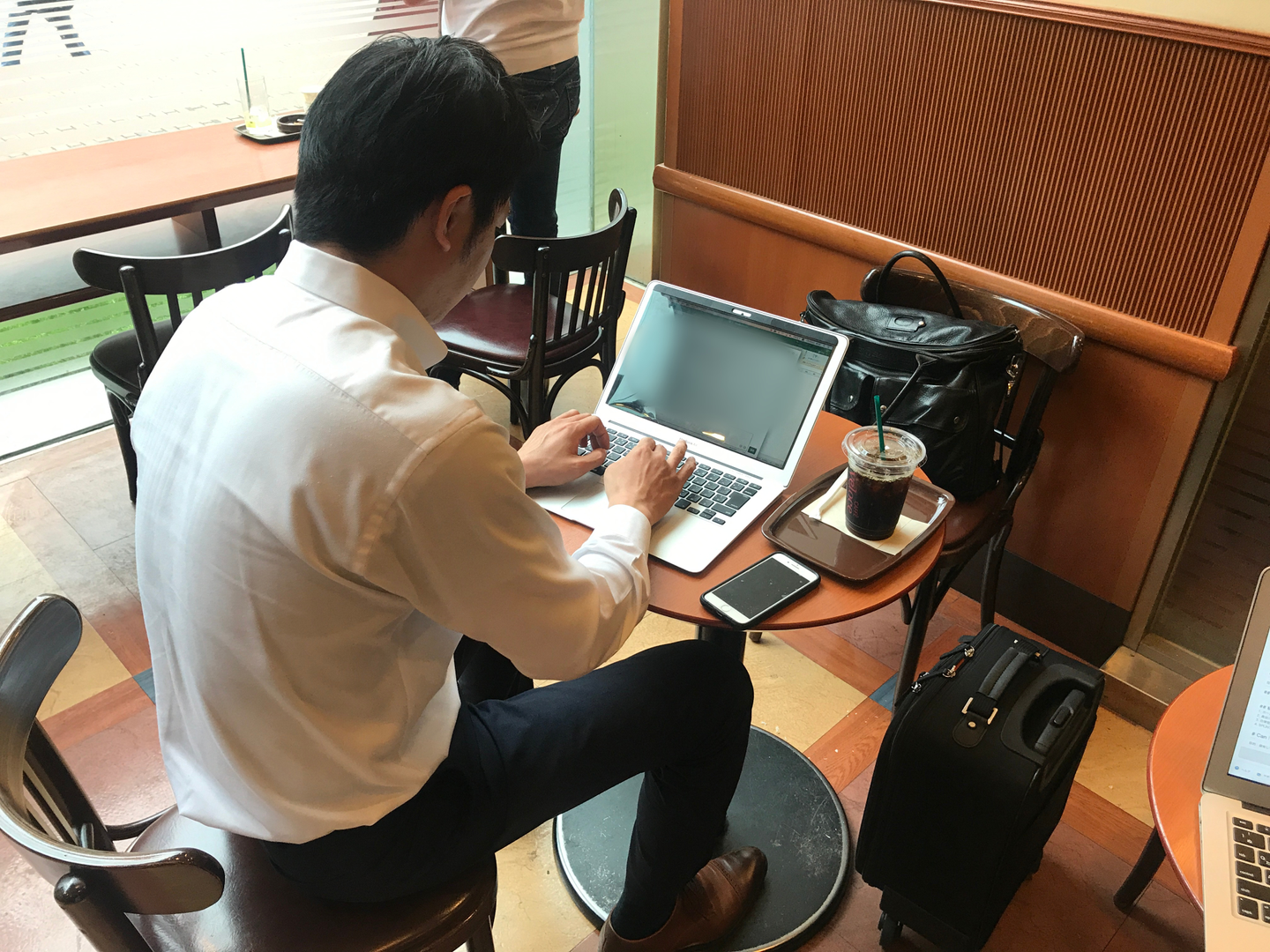 Kさんは複数社のクライアントを抱えているので、他クライアント企業の取引先対応や、本日の商談中に対応できなかった業務などを、出張先のカフェで行っています。