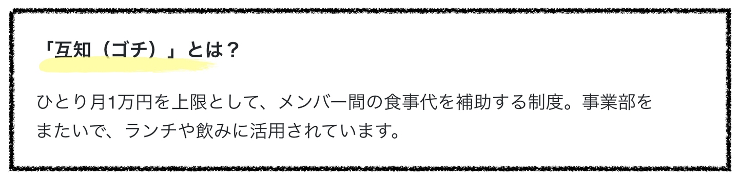 ちなみに、ここでも社内制度の仕掛けがあって、通称「互知(ゴチ)」と呼ばれるメンバー間の食事代を補助する制度です。従業員同士のコミュニケーションを活性化させることを目的としています。