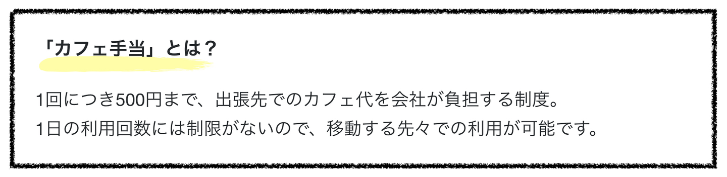 ちなみに、ここでも社内制度についてご説明すると、出張メンバーが集中できる仕事環境を整えることを目的とした「カフェ手当」という制度があります。