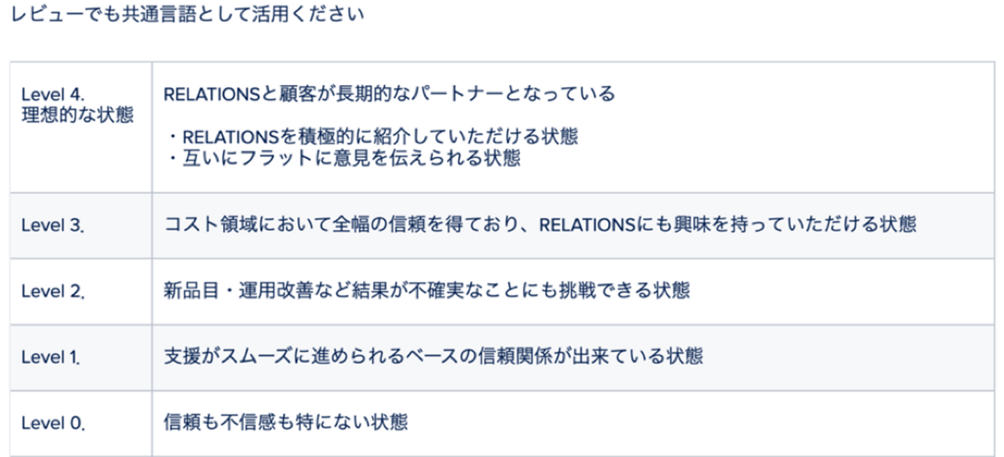 社内用にまとめたノウハウページなので、ブログで公開できない部分も多いのが残念ですが、①の『私たちが目指す信頼獲得レベル』を5段階に定義して共通言語化したものをご紹介しようと思います。