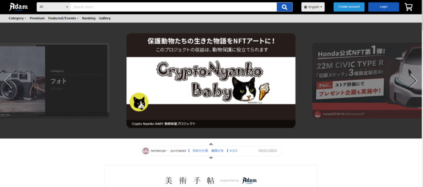 Adam byGMOは、GMOの子会社が運営するNFTマーケットプレイスです。 2021年8月31日にβ版の提供を開始され、2021年12月13日に英語版と同時に正式版も提供されています。 様々なジャンルのNFTが扱われており、具体的には下記です。