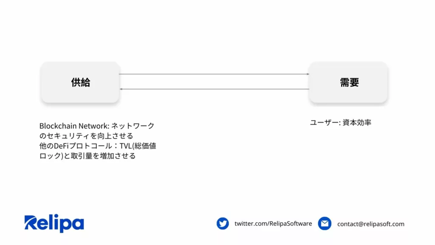 - ユーザー: ユーザーはDeFiプロトコルからのブロック報酬とインセンティブの両方を通じて、より多くの収益を得ることができます。これにより資本効率が向上します。