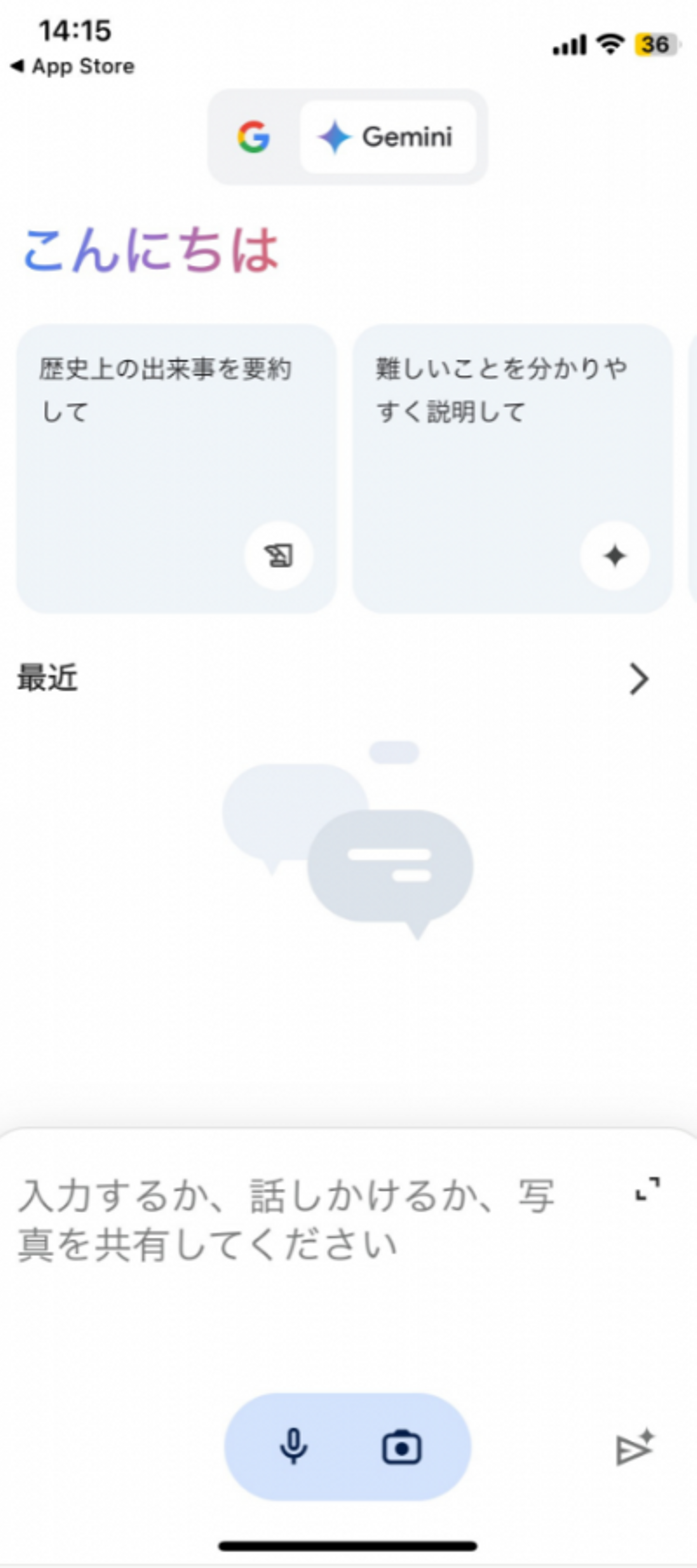 Webブラウザと同じようにテキストボックスに質問を入力するだけで、簡単にGeminiとやり取りをすることができます。テキストだけでなく、画像アップロード、音声が使用できます。