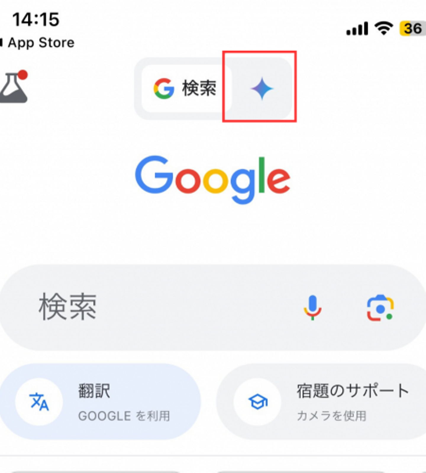 Googleアプリを開くと、通常のGoogle検索画面が表示されます。画面上の「♦」のマークをクリックすると、Geminiの画面に切り替えることができます。