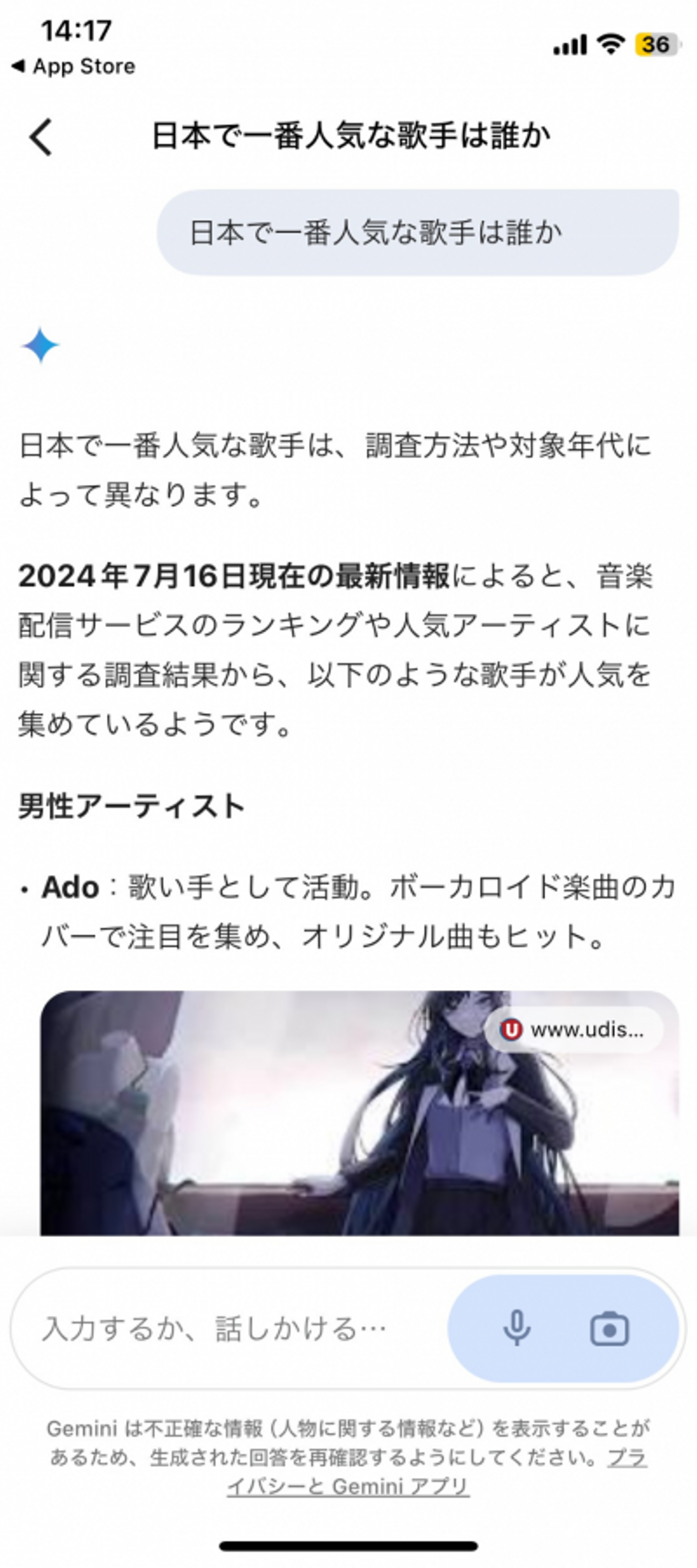 この機能は、他のAIモデルでよく見られる「ハルシネーション(Hallucination:幻覚)」 (もっともらしいが「事実とは異なる内容」や「文脈と無関係な内容」といった誤情報を、人工知能(AI)が生成することである )現象をある程度克服することを目的としています。また、Geminiの応答は、Google検索を通じてさらに深掘りするのも簡単であり、Gemini自体でウェブサイトから画像を取得することも非常に簡単です。この点は、現時点では他のAIモデル(例えばChatGPT)にはできないことです。これは、GeminiがGoogleのエコシステムを享受していることに起因しています。