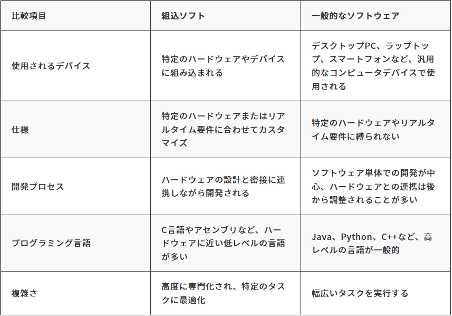 組込ソフトウェアと一般的なソフトウェアには、いくつかの重要な違いがあります。以下の表にこれらの違いをまとめました。