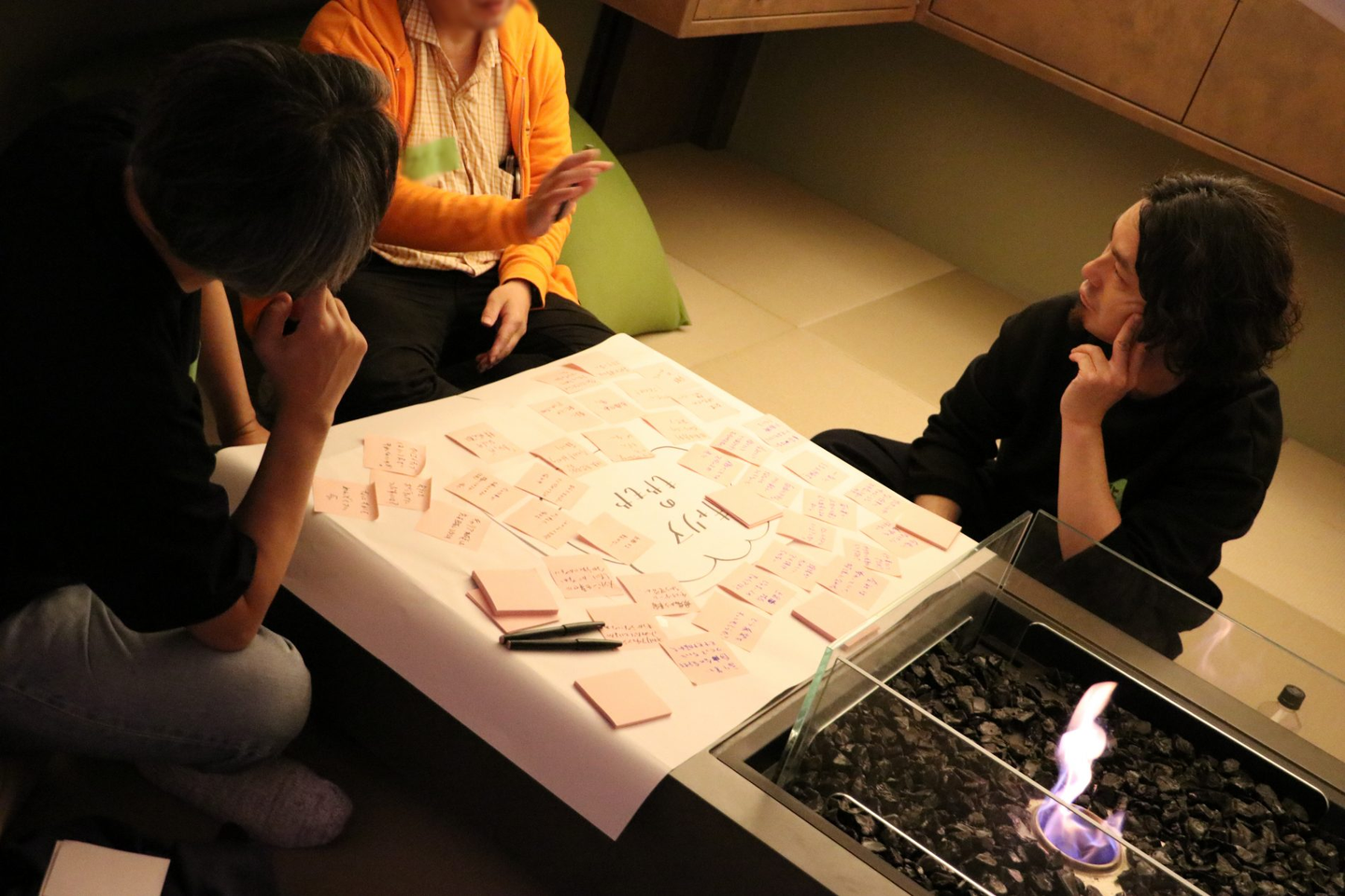 用意したトークテーマは、「関係性のもやもや」「上司部下のもやもや」「働き方のもやもや」「キャリアのもやもや」の4つ。話された内容は、付箋や模造紙に書かれ、セッションの回数を経るたびに、どんどん参加者の思いや考えが溜まっていく仕組みです。トークテーマに沿って対話するだけでなく、ヌシが投げかける問いかけを通して、場の温度をどんどん上げていきます。