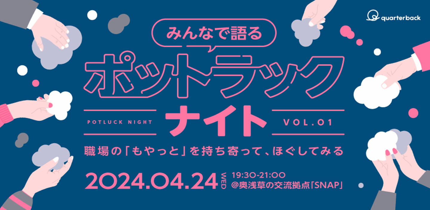 こんにちは!クオーターバック広報の松井です。僕たちクオーターバックの運営するSNAPでは、毎月さまざまなイベントが行われています。 今回は2024年4月に開催した「みんなで語るポットラックナイト vol.1『職場の“もやっと”を持ち寄って、ほぐしてみる』」のレポートをお届けします。 SNAPで開催されるイベントに興味がある・参加しようかなと迷っている方の参考にもなれば幸いです。