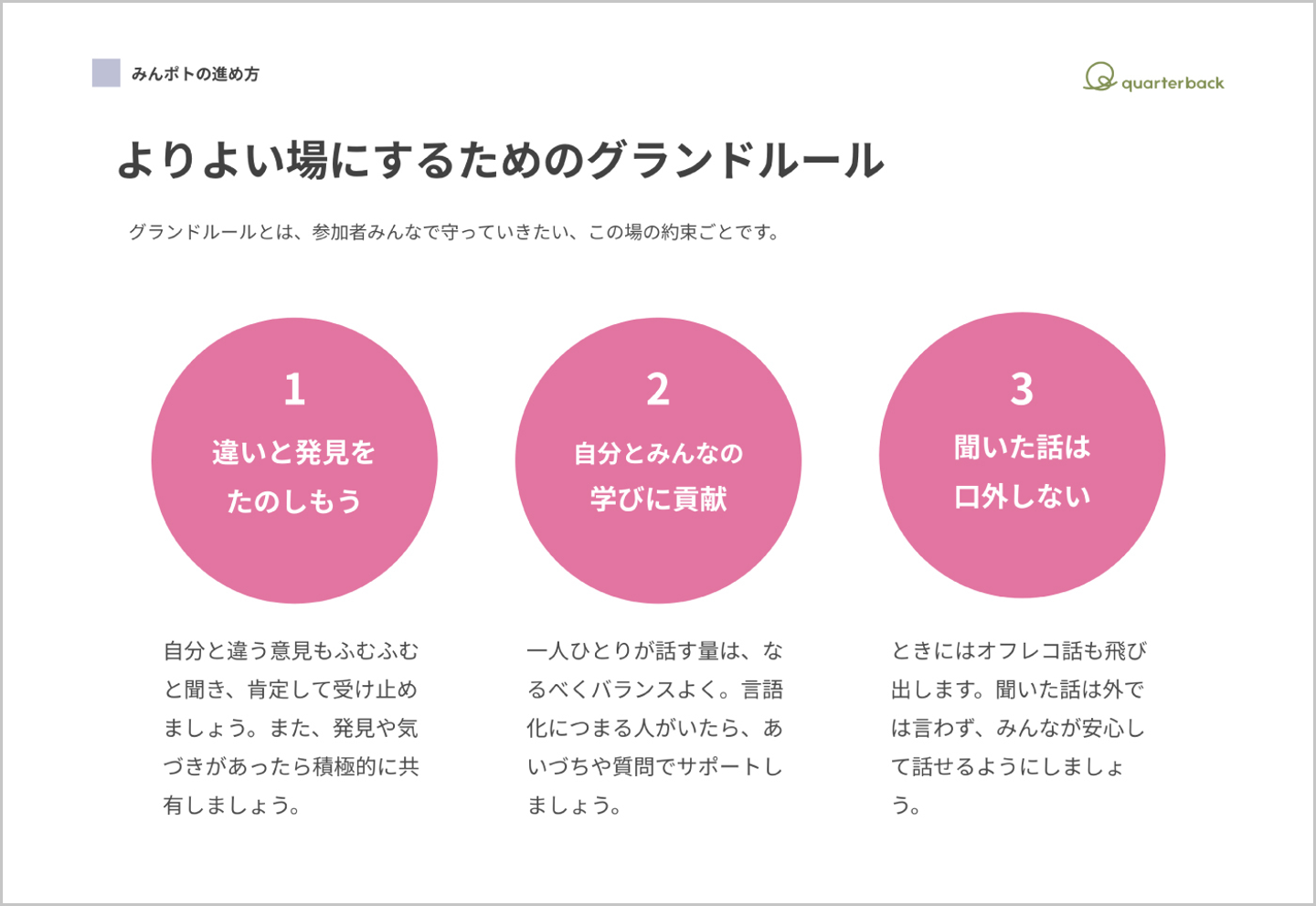 ちなみにクオーターバックでは、社内の各部門などでも会議のグランドルールを設定し、運用しはじめています。「心理的安全性が高まった」「気軽に手を挙げられるようになった」といった声も聞かれ、場づくりにおけるグランドルールの力を実感しているところです。