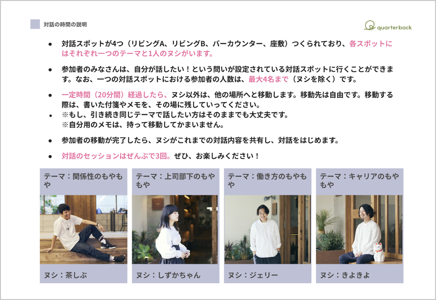 当日は十数人の方にお集まりいただき、まずは参加者全員の簡単な自己紹介からスタート。続いてクオーターバックの会社紹介に加え、みんポトのグランドルールについて参加者の皆さんにお伝えしました。