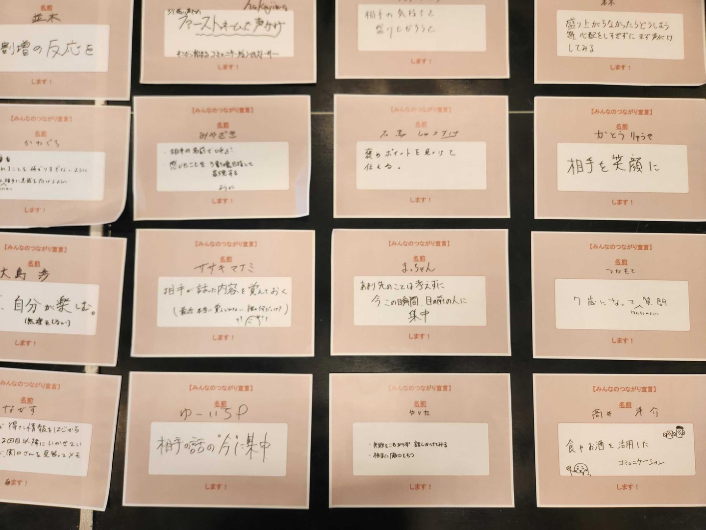 ワークショップの最後に、今後、つながりづくりをする際やコミュニケーションをとる際に意識していきたいこと「みんなのつながり宣言」を、それぞれワークシートに記入。これを見ていると、応援したくなりますし、自分も頑張ろうって思えますね。