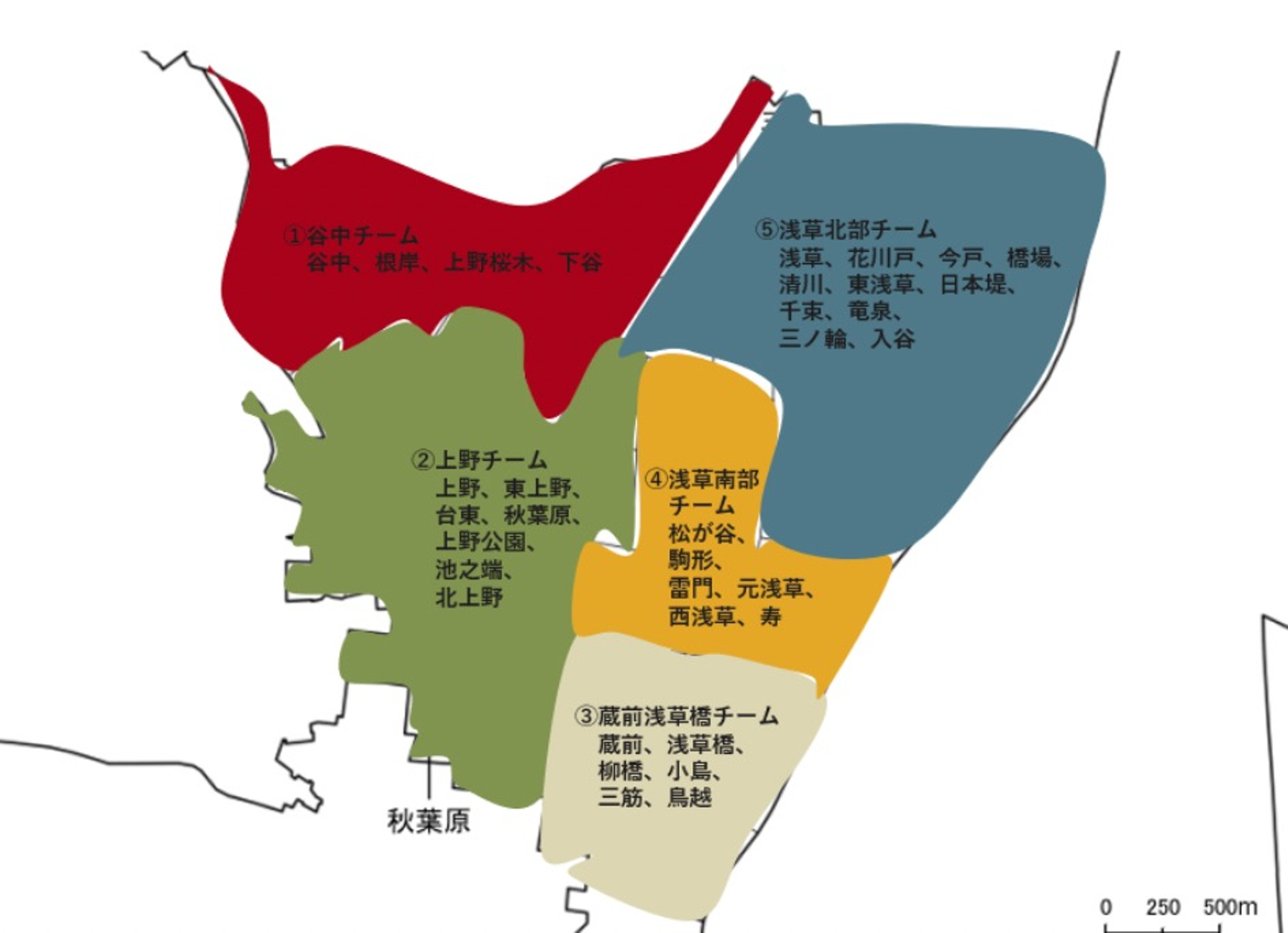 勉強会は台東区を5つのエリアに分け、4人ずつのグループで気になるスポットをまわるフィールドワークと、全員で行うワークショップパートで構成。勉強会の前には各グループで事前リサーチを行い、後日フィールドワークで発見したことを全社に共有する発表会を設けました。