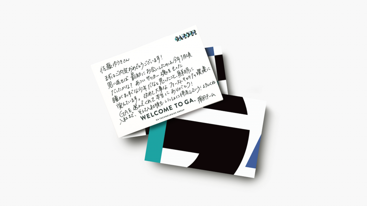 とくに最初に人事から内定者一人ひとりに配ったメッセージカードは、裏側の模様をつなげると、なんとひとつのメッセージに!