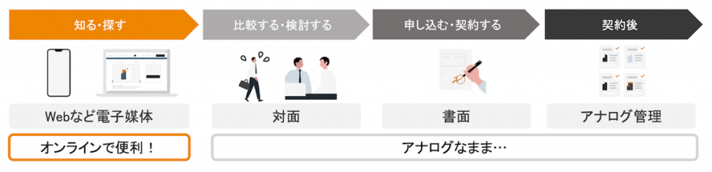 これまで不動産業界では、物件を探すまではオンラインでも、申込は店舗に行き、契約後はアナログで書類を管理することがほとんどでした。