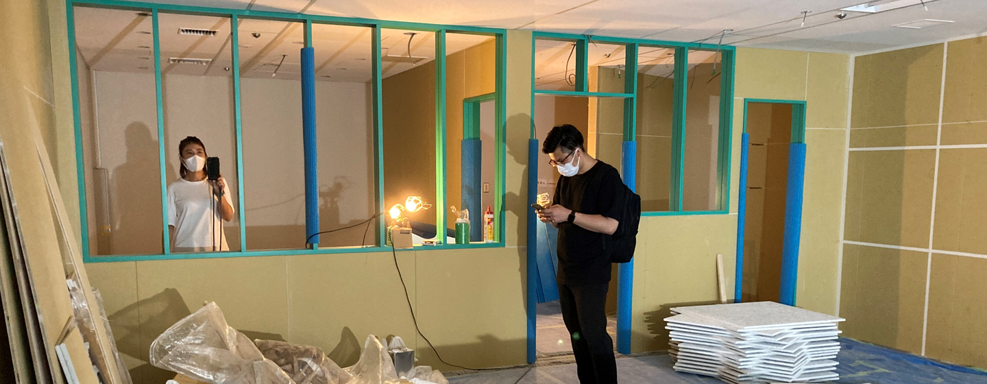※壁が埋まった!いよいよイメージが具体化さてれきてワクワク。現場確認する石塚とアンドロップ真庭さん。