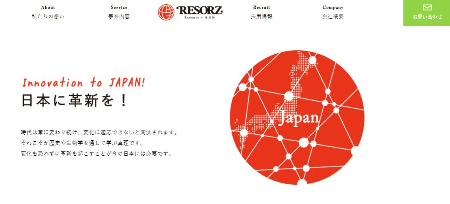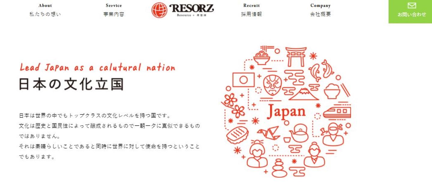 TOPページでは、社名の由来×Resorzが掲げる理念を表示。白×赤で日本の国旗のようなデザインに。