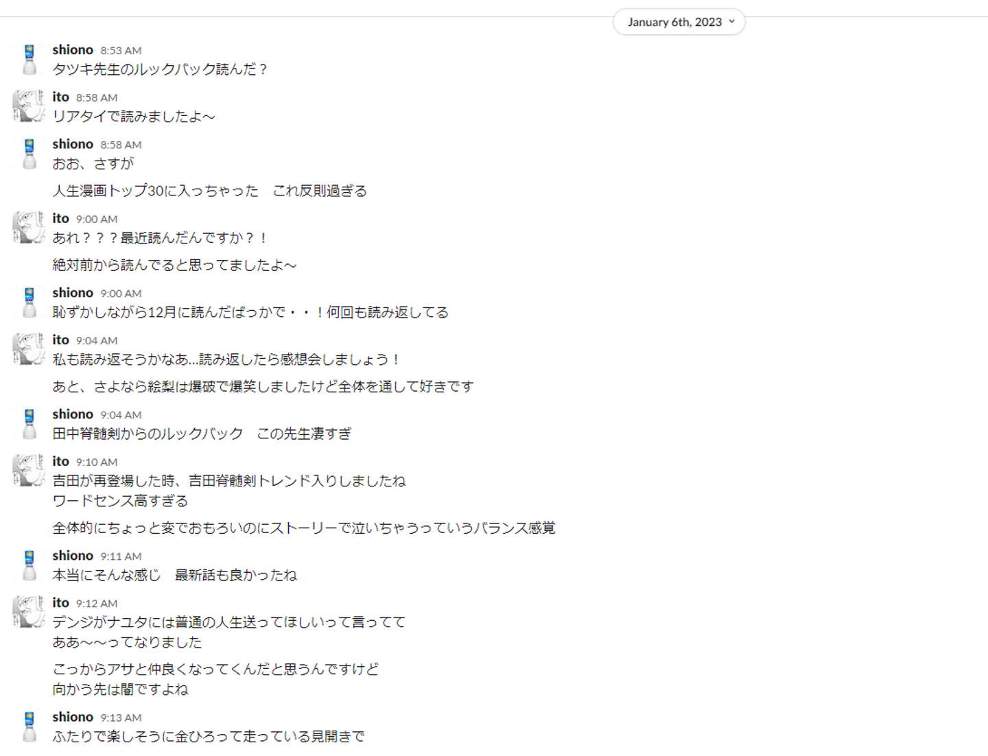 また、リゾームの中でも漫画への熱意が強く、たまに熱い感想が抑えきれなくなるとSlackで唐突に最近読んだ漫画の感想を送ってきます。THE FIRST SLAM DUNK公開時は私もスラダンオタクなので異常に盛り上がりました。この当時はルックバックとチェンソーマンが流行ってました。きっとルックバックの映画も観に行くと思われます。