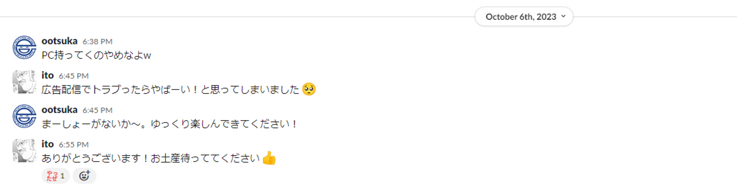 私事ながら昨年7月に同僚と結婚しまして沖縄に新婚旅行に行ったんですが、 全社員向けに「沖縄5泊6日の旅に出ます、社用PC持っていきますので何かあれば連絡ください」とメールしたら、大塚さんから「PC持ってくのやめなよw」とSlackが来ました!