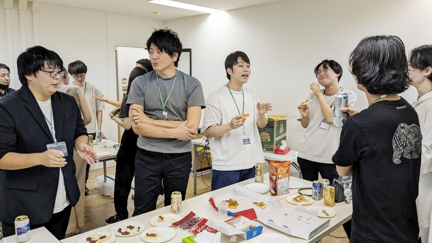 ↑社内飲み会でエンジニアたちと喋るリアル役員(グレーのTシャツ/塩野さん)です。