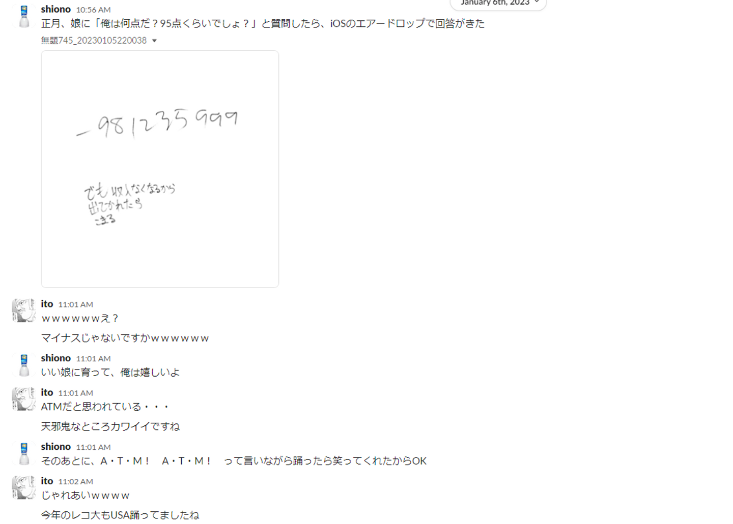 娘さんから塩野さんへのフィードバックをたまに共有してくれるんですが、ほっこり系ですね。最近は娘さんと車で車内泊して遊んだりもしているようです。
