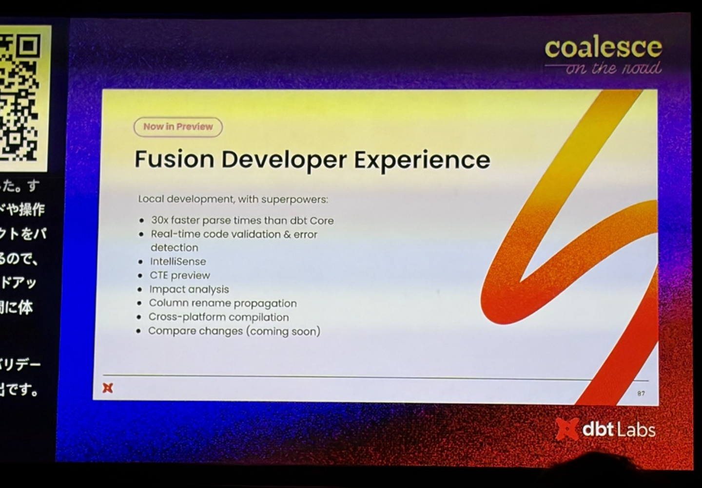 次の発表につながるのですが個人的にはdbt Fusionがもたらす中心的なものは開発者体験だ、と言っていたのが印象的でした。
