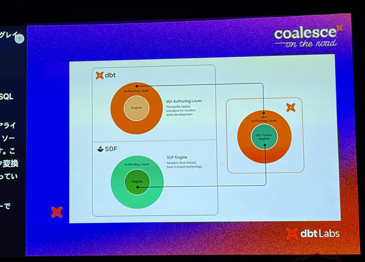 dbt Fusionについて、外側はSQL、YAML、seedなどこれまで利用してきた表層の記述はそのままに、Jinjaレンダリングや依存関係構築をしているEngine部分をSDFでの技術を利用して完全に置き換えた、と説明していました。(ジャム入りのドーナツのジャム部分を入れ替えたようなもの、と例えていました)