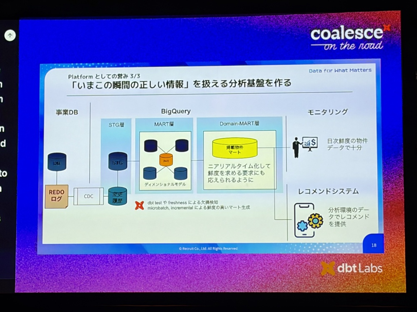 - モニタリング分析ではバッチで前日分のデータを見ればいいが、レコメンドシステムに利用するにはニアリアルタイムの鮮度が必要でいかに素早くマートにするかの戦いをしている(そのなかでincremental, freshness, data_testなどの機能が活躍)