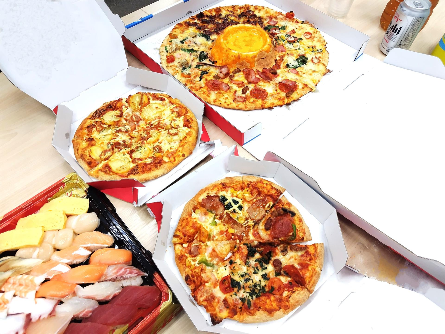 デリバリーピザをお願いしたり、親睦会委員の方・他の社員の方がお手伝いしてくれて