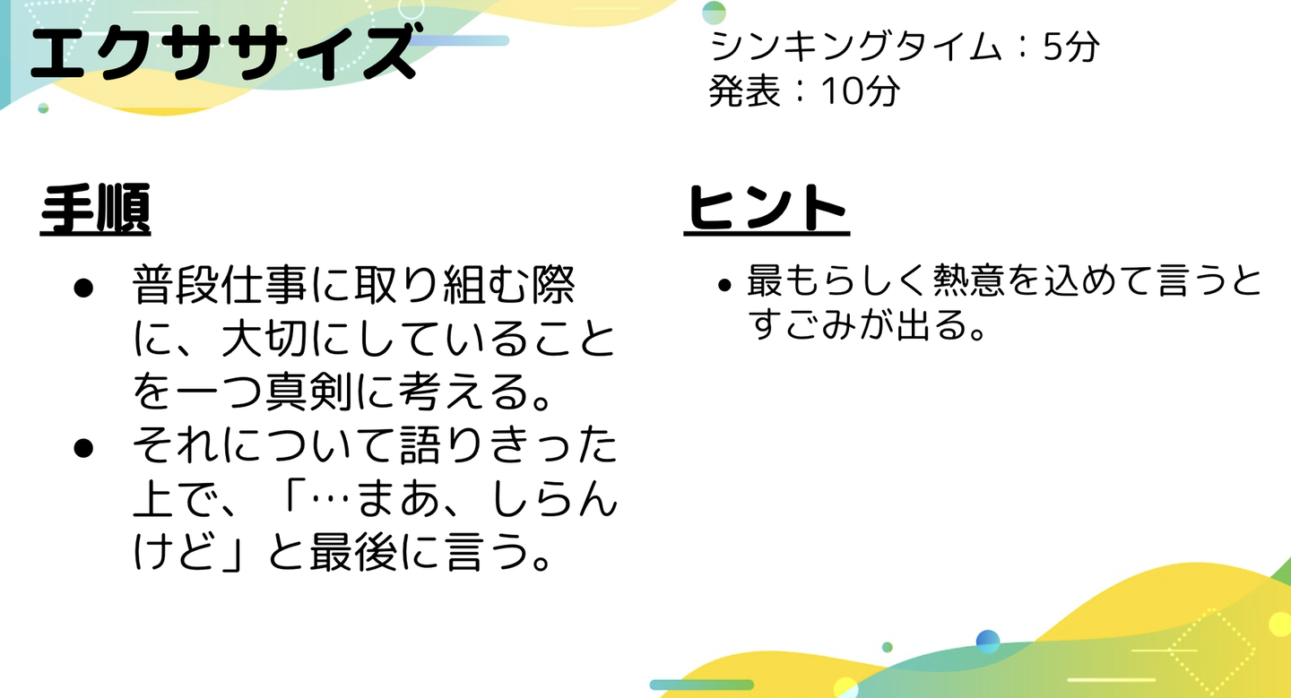 こんなエクササイズがあり、個人で考えた後にグループ内で共有しました。