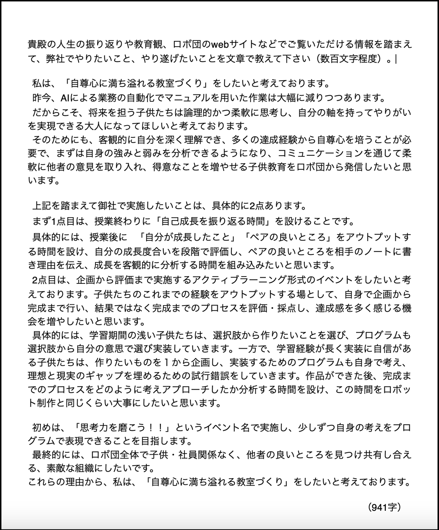 👉 たとえば、「子供たちが自らの可能性に気づき、挑戦し続ける環境を創ることが教育だ」といった風に、実体験(例:数学が苦手な生徒との取り組みなど)を盛り込んで、あなたの熱意をしっかり伝えてください!