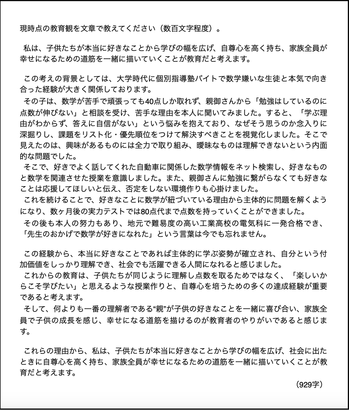 → あなた自身の教育に対する考え方を、実体験をもとに明確に示してほしいというものです。