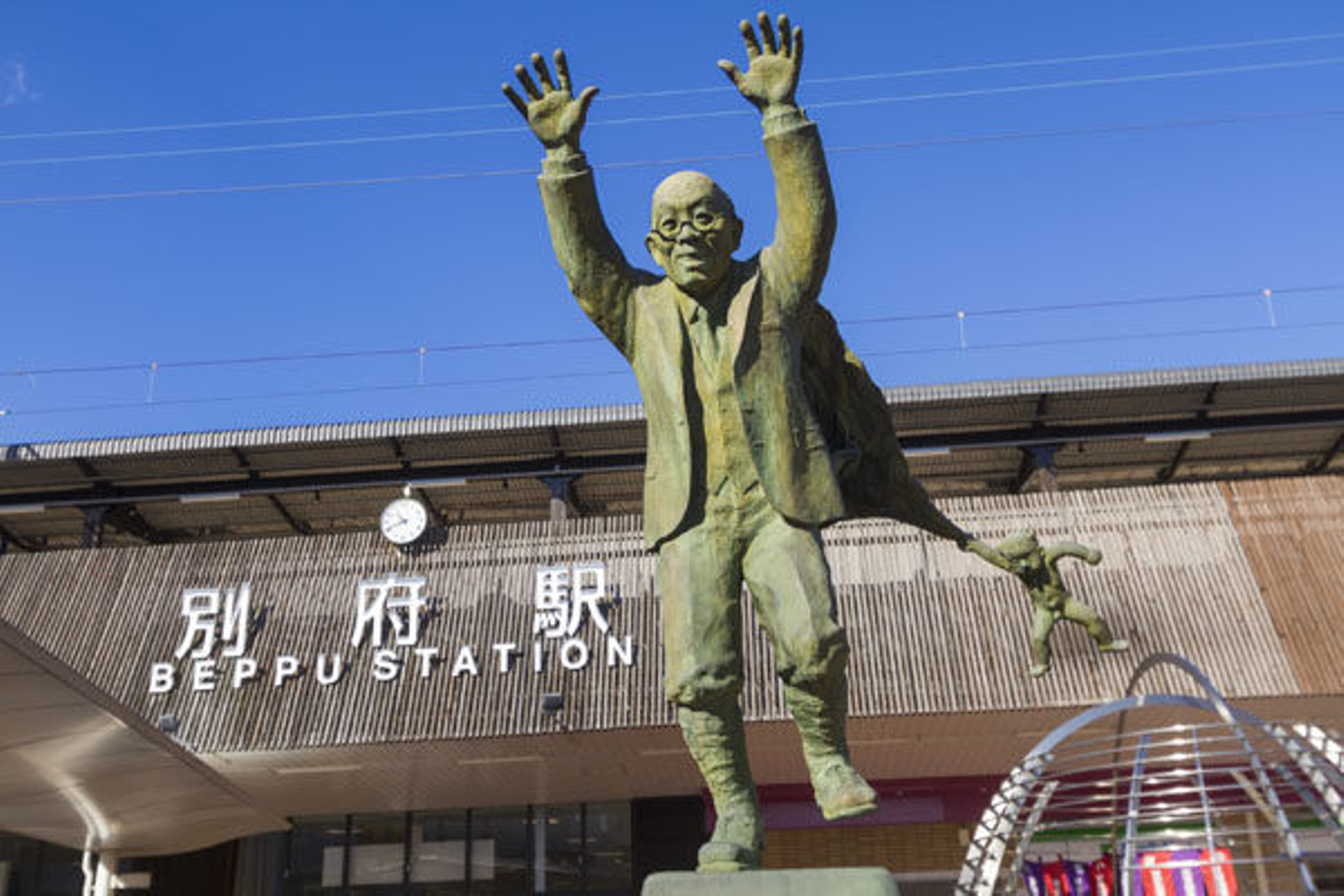 「山は富士、海は瀬戸内、湯は別府」というキャッチフレーズや独創的な方法で別府を有名観光地へと名を広めた別府の父:油屋熊八の銅像。