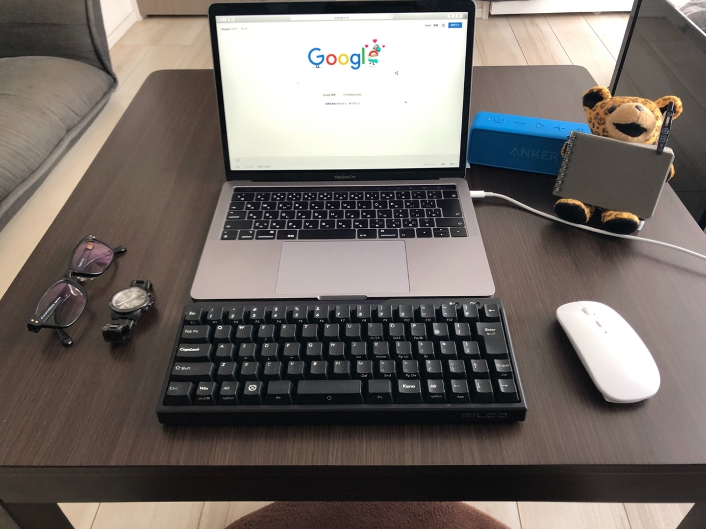 あと、右手がマウスから遠ざからないように、キーボードはテンキーレスにしています。