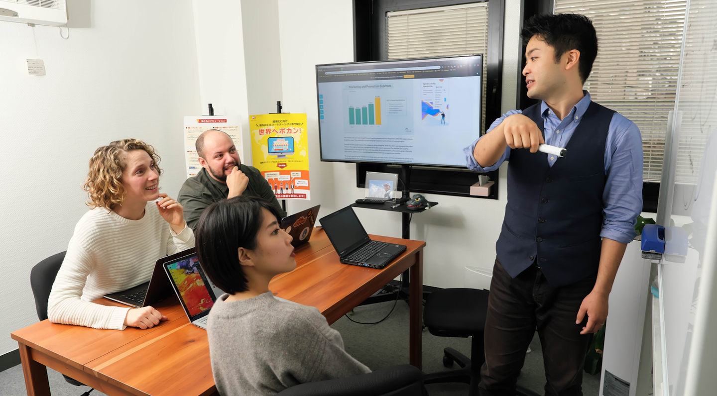 入社時は、「言語の壁が不利にならないか」と不安もありましたが、ボカンの社員14名中の7・8名は外国人ということで、すぐに会社には馴染めました。社内のコミュニケーションは日本語がメインで、日本語が難しい場合は英語で説明してもらえますので、個人に合わせて言語を使い分けてくれます。クライアントとのコミュニケーションも特に問題ありませんでした。
