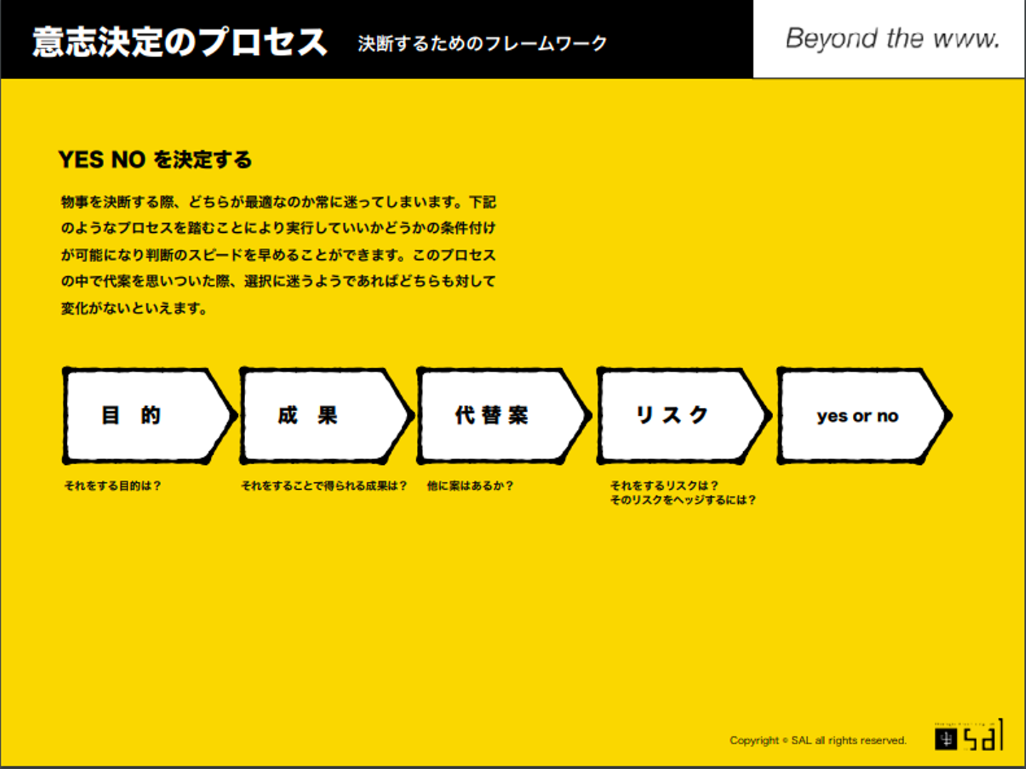 こういうことを積み重ねていくことで結果的には効率化になりますし、ひとりひとりに考える力が育まれます。あと、この意思決定のプロセスはプライベートでも使えます。車を買うときでも転職をするときでも。