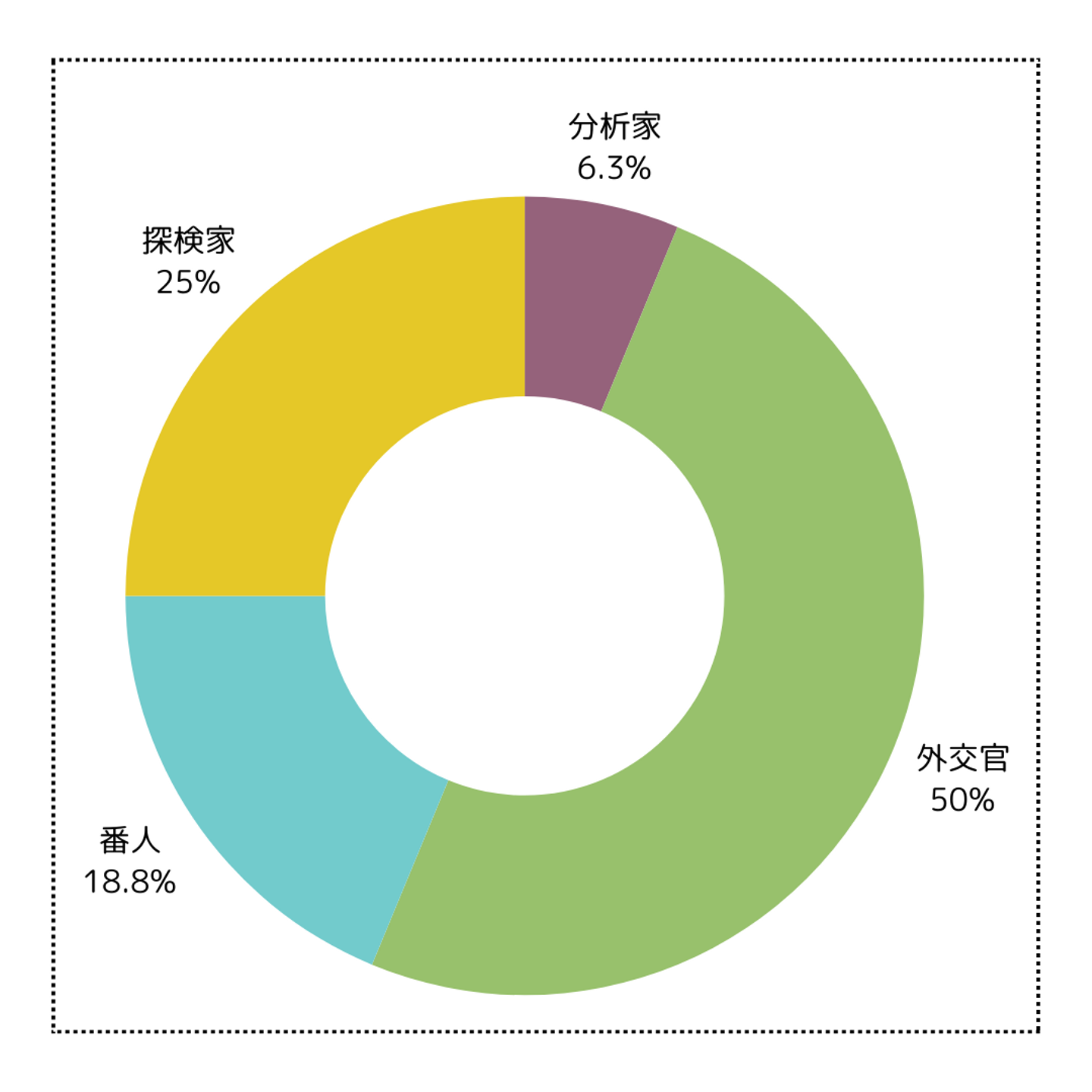 ほかにも、好奇心が旺盛で斬新なアイデアを生み出すことが得意な【冒険家】、創造力が優れており、身の回りにある様々なことからヒントを得て人々の役に立つものを作り出すことが得意な【巨匠】など、まさにWEBコンサルティング事業部がピッタリな性格タイプも!