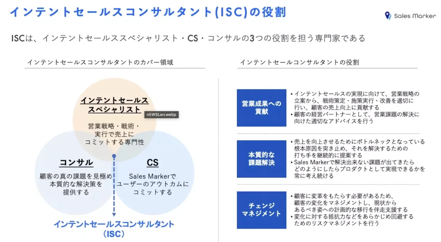 企業の「Web行動」からニーズの有無を判断し、顧客起点で営業活動を進める「インテントセールス」という手法を実現しているSales Marker。インテントセールスを可能にするためには、一般的なCS(カスタマーサクセス)とは異なる専門性と、お客様の継続的な成果を生み続けるコンサルティング力が必要になります。そのような観点から、弊社ではCS職と異なる位置付けとしてISC(インテントセールスコンサルタント)職のポジションがあります。