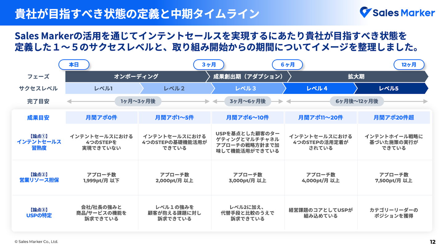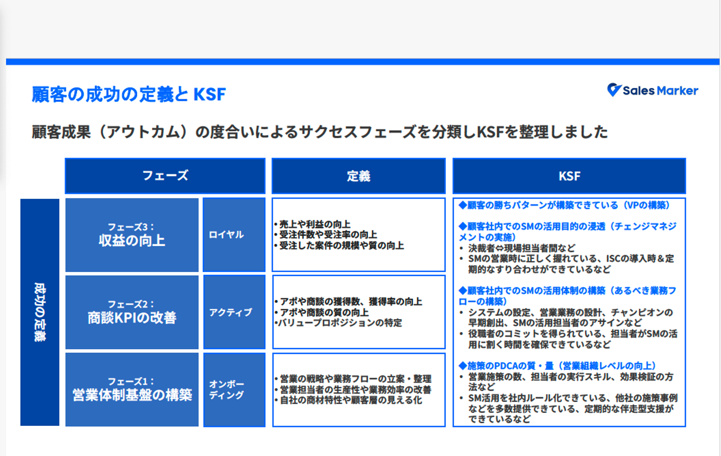 フェーズ1は営業の業務フローを確立させ、体制の基盤を整えます。フェーズ2では商談アポ数を増やし、質を高めていきます。フェーズ3で最終的に受注・売上貢献を達成。そのためのキーファクターを解明するために、「Sales Marker」を活用し、PDCAの量と質を同時達成させていくわけです。