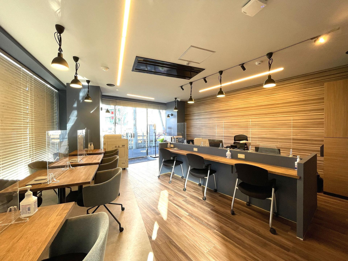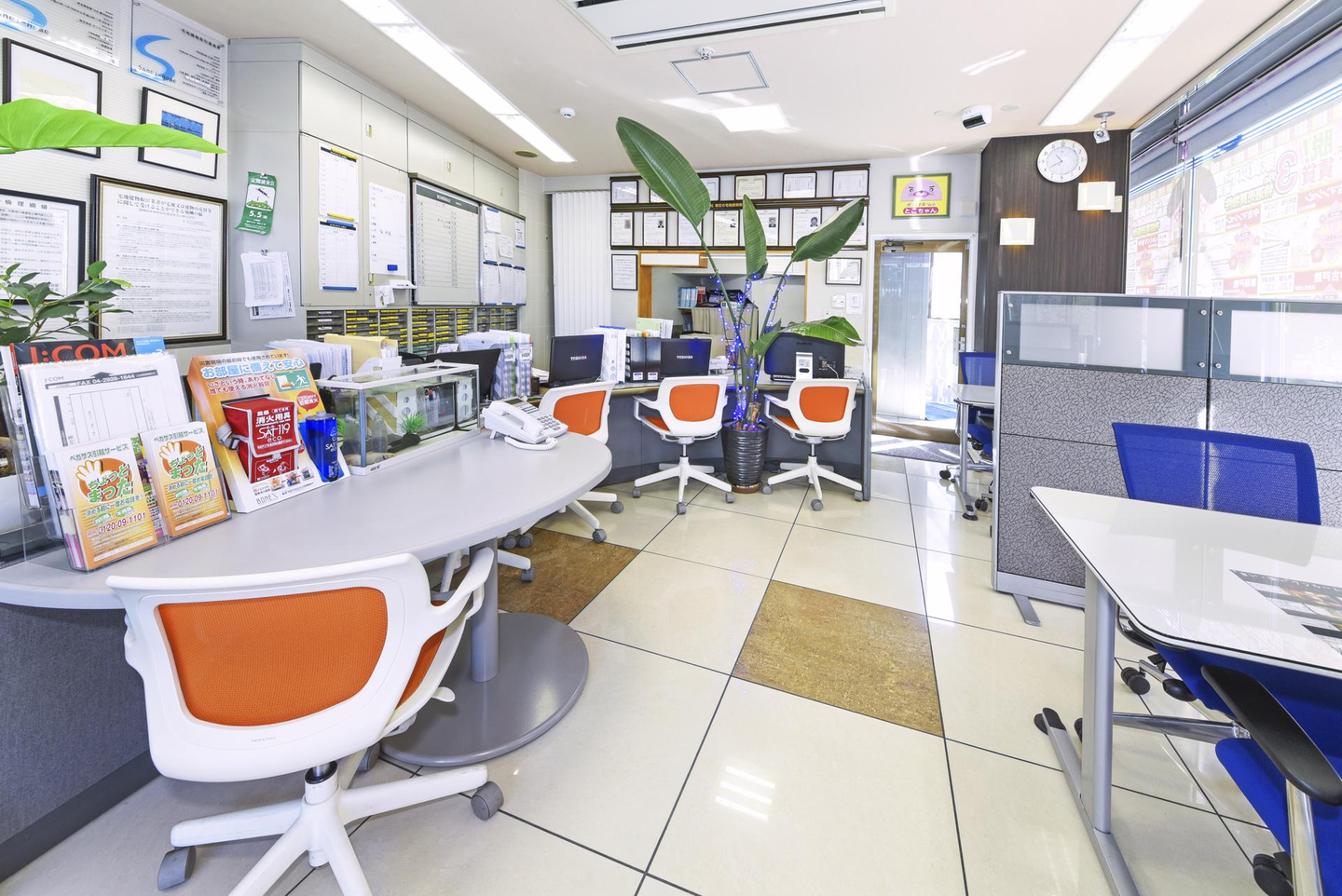 左側のカウンターは賃貸営業課のスタッフが2ヶ所合わせて最大5名まで、お客様が3名~4名が座れるカウンター(デスク)となっており、賃貸営業課こだわりの特注カウンターです!社員席側には電話線やLANケーブル、電源などが接続できるようになっており、配線が散らからないのが嬉しいですね!店内は常にジャズ等のBGMが流れているのもポイントです!