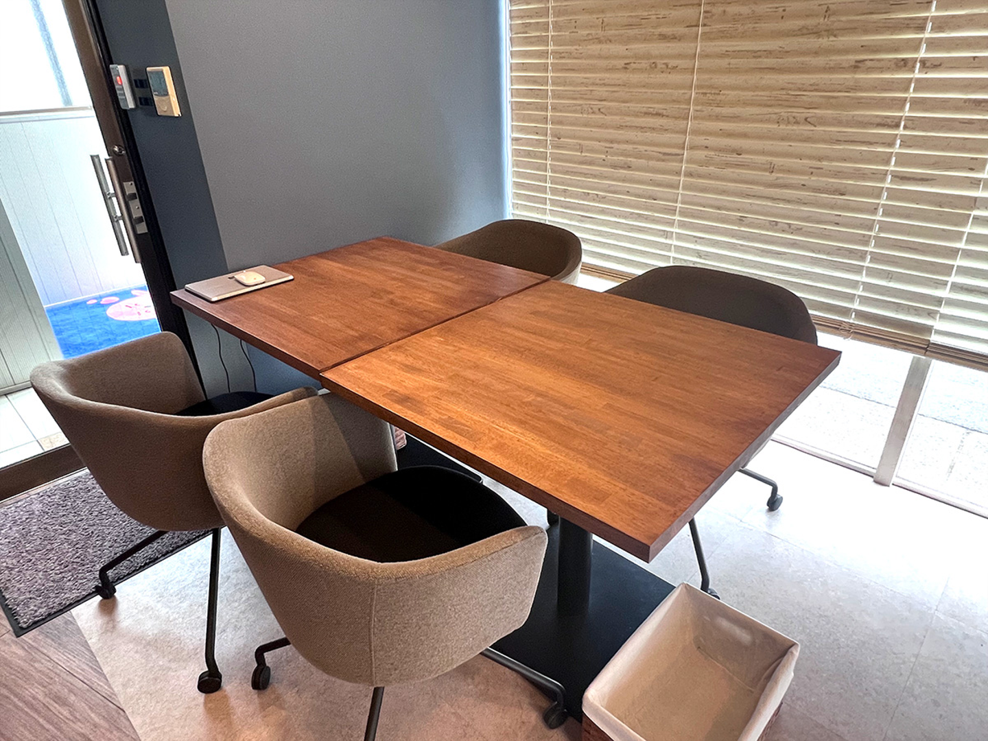 ▲接客用テーブル(お客様出入り口から向かって右手側、写真奥の扉は2階へ続く従業員通用口)