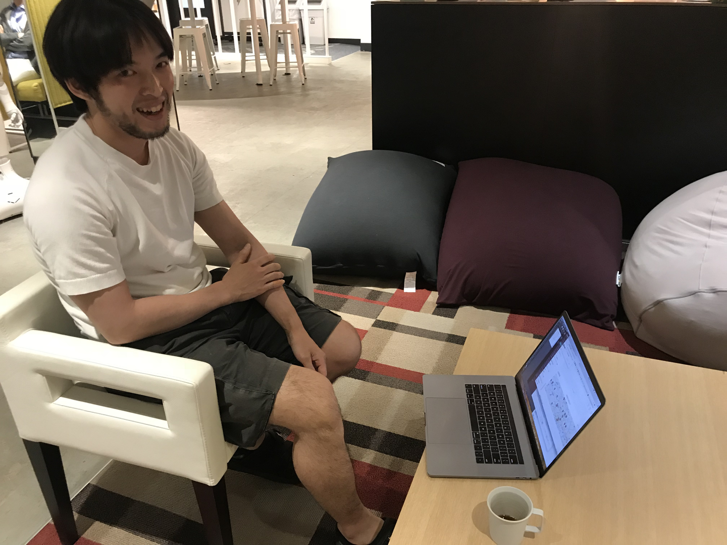 オープンスペースで話を聞かせてくれた大橋 @入居しているFINOLABのラウンジにて