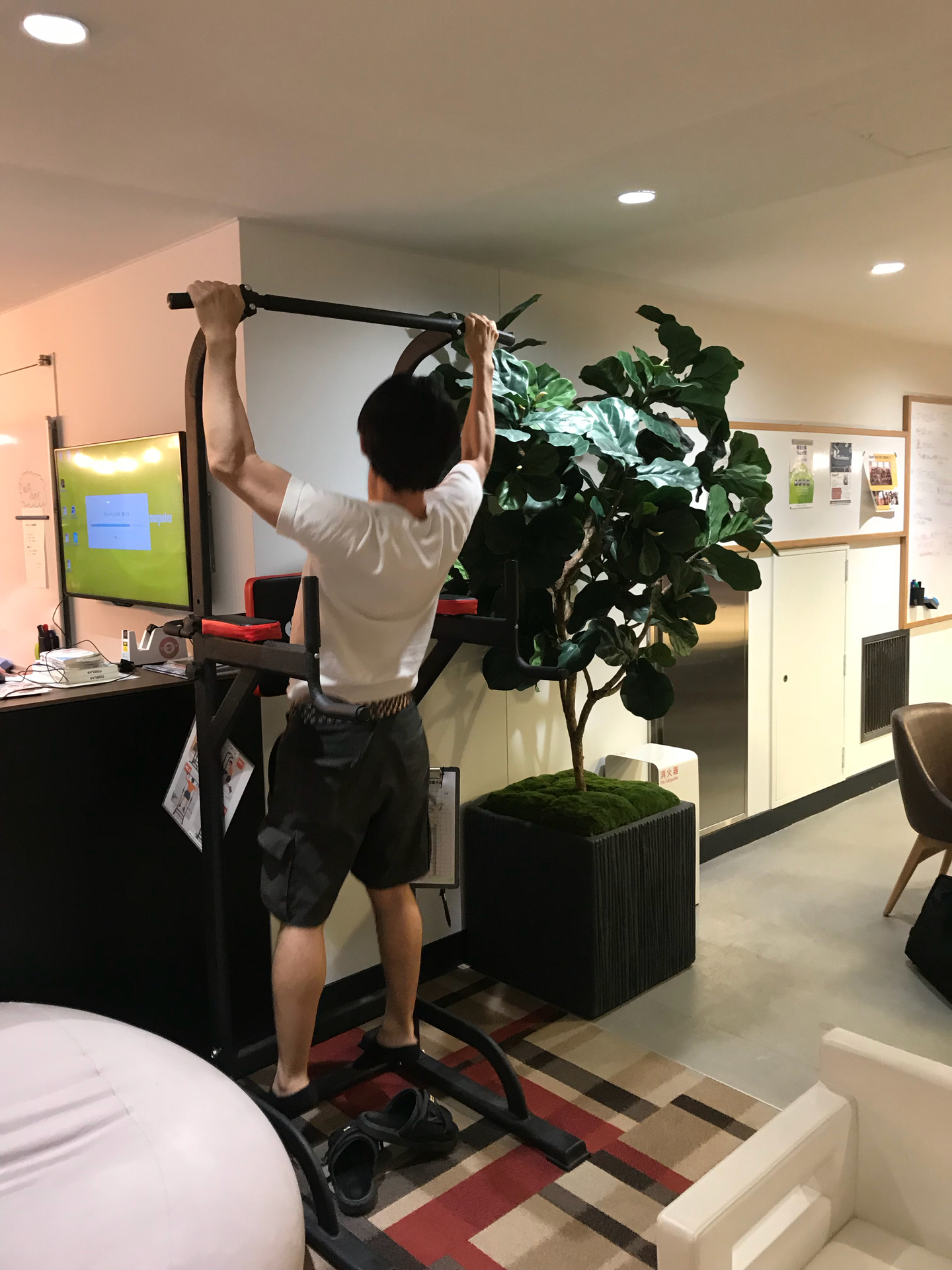 鉄棒が趣味の大橋。最近、オープンスペースに設置された筋トレマシンで懸垂中