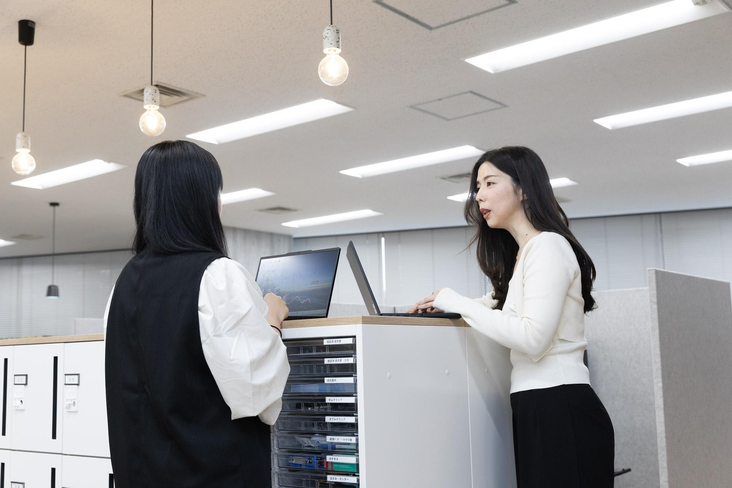同じ部署の先輩後輩、なにやら業務の相談中。(本社フリースペースにて)