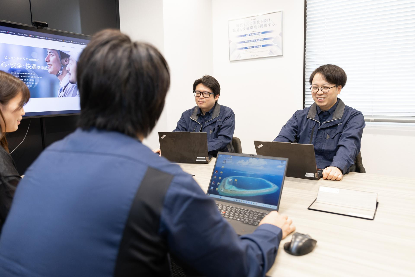 本社で働く若手社員たち。(オフィスの会議室にて)