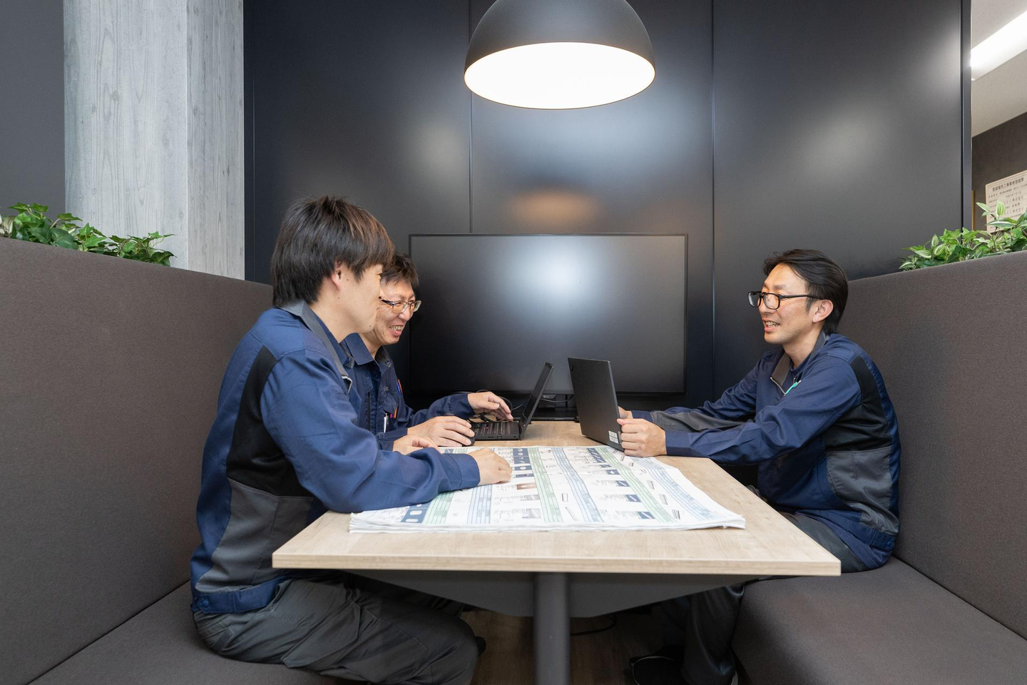 図面を広げて相談中。(本社フリースペースにて)