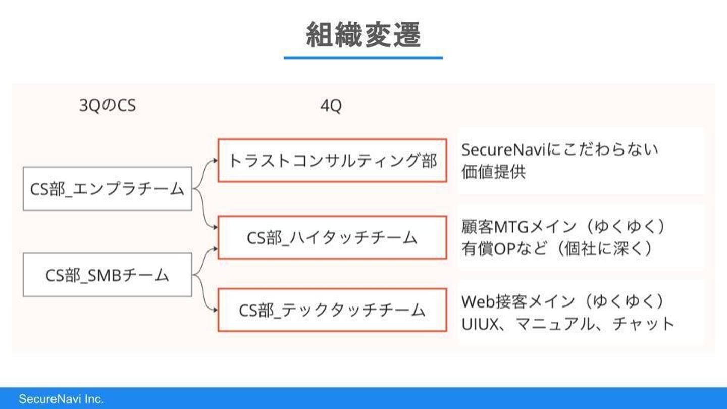 顧客のフェーズやニーズに合わせて根本的な課題解決を行うために、CS部(ハイタッチ/テックタッチ)・トラストコンサルティング部で役割を分ける方針としました。