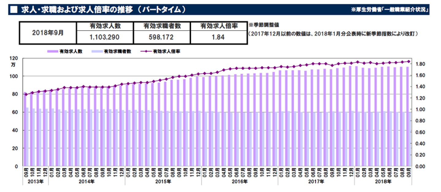 2018年9月の数値ではパート・アルバイトの「有効求人倍率」は1.84。